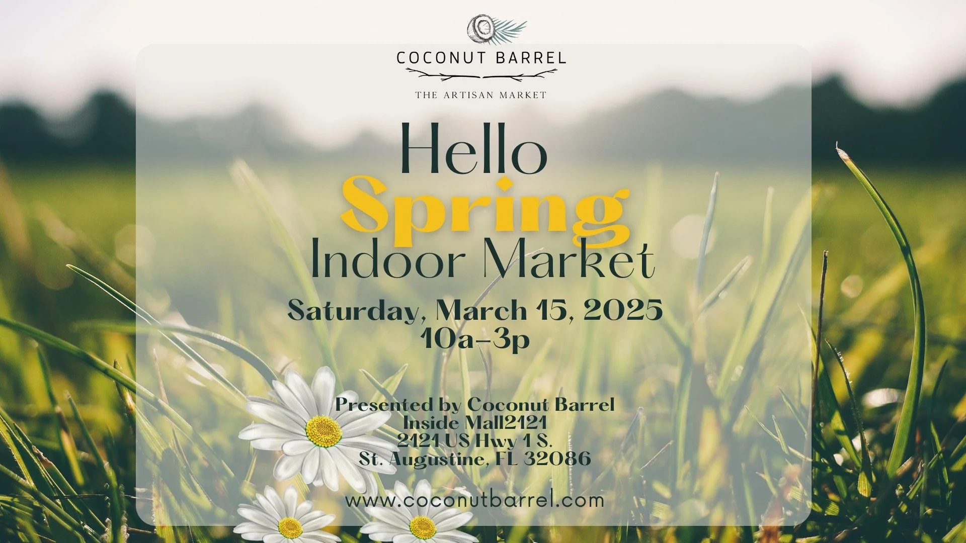 Join us for a fun-filled shopping experience and let's celebrate the beginning of Spring together! Enjoy the unique finds at our indoor market, featuring over 40 vendors inside Mall 2121. After exploring the pop-up shops, head over to Coconut Barrel for a free refreshing lemonade and sip while you shop. Extra discounts will be drawn at the register for the first 100 customers.