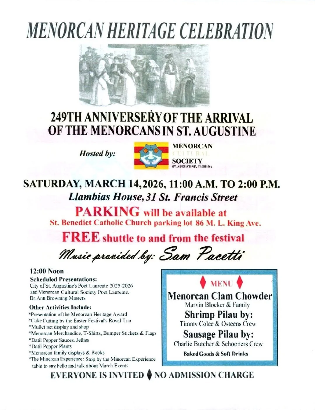 The Menorcan Cultural Society will host the Menorcan Heritage Celebration in honor of the 249th anniversary of the arrival of the Menorcans in St. Augustine on Saturday, March 14, 2026, from 11 a.m. to 2 p.m. at Llambias House, 31 St. Francis Street. The celebration will feature live music by Sam Pacetti, scheduled presentations beginning at noon, and a variety of heritage displays and activities, including the presentation of the Menorcan Heritage Award, cultural exhibits, merchandise, and family history displays. Guests can enjoy traditional dishes such as Minorcan clam chowder, shrimp pilau, sausage pilau, baked goods, and soft drinks. Parking will be available at St. Benedict Catholic Church, with a free shuttle provided to and from the festival. The event is open to the public and there is no admission charge.